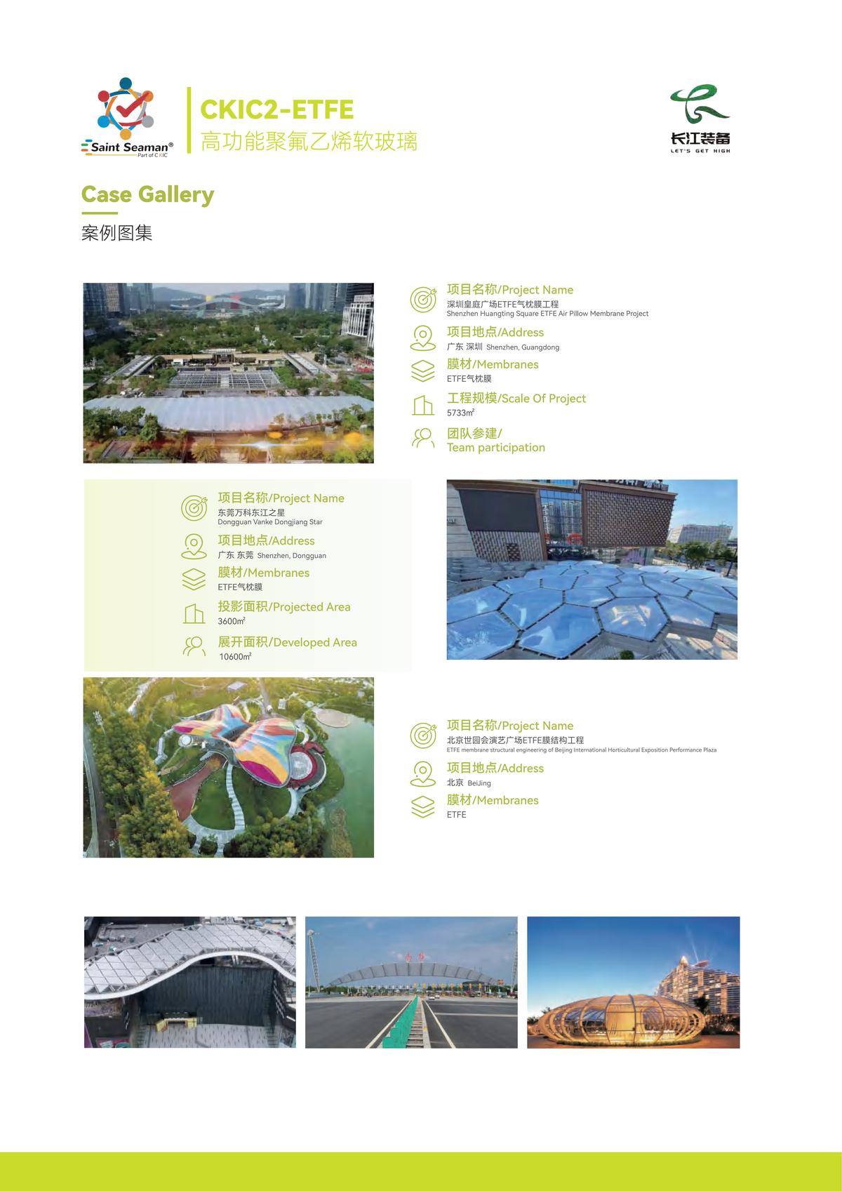 密度仅为1.73-1.77 q/cm’,重量仅为玻璃1%;拉伸强度高达50 MPa,0.2mm厚度薄膜拉裂强度达1200N/5cm;透光率可达95%,能通过镀点印刷技术精准调控透光率43%-95%;延展性>400%,能承受极端形变而不破裂,适用于曲面和异形结构设计;长期适用温度-80°℃-220℃,适应严寒、高温及骤变气候,稳定性远超普通聚合物;ETFE膜材熔融温度达200℃℃,防火等级B1级的难燃材料,安全可靠;抗紫外线、臭氧及辐射,使用寿命达25-35年。···