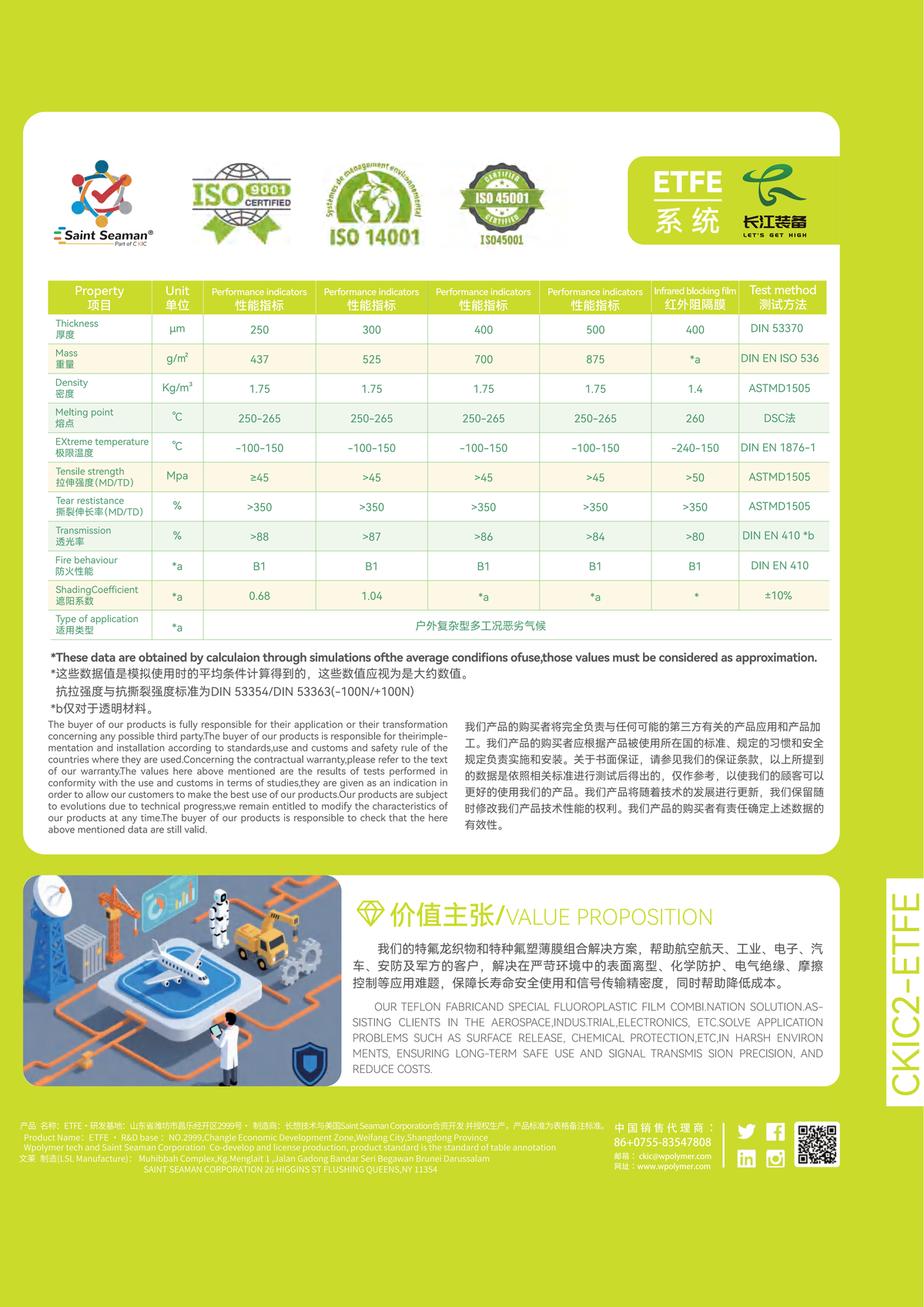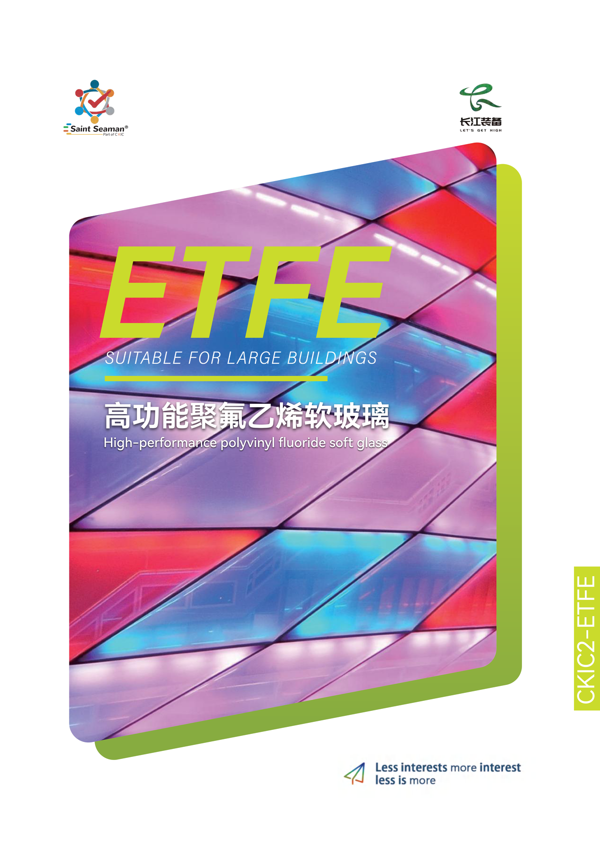 密度仅为1.73-1.77 q/cm’,重量仅为玻璃1%;拉伸强度高达50 MPa,0.2mm厚度薄膜拉裂强度达1200N/5cm;透光率可达95%,能通过镀点印刷技术精准调控透光率43%-95%;延展性>400%,能承受极端形变而不破裂,适用于曲面和异形结构设计;长期适用温度-80°℃-220℃,适应严寒、高温及骤变气候,稳定性远超普通聚合物;ETFE膜材熔融温度达200℃℃,防火等级B1级的难燃材料,安全可靠;抗紫外线、臭氧及辐射,使用寿命达25-35年。···