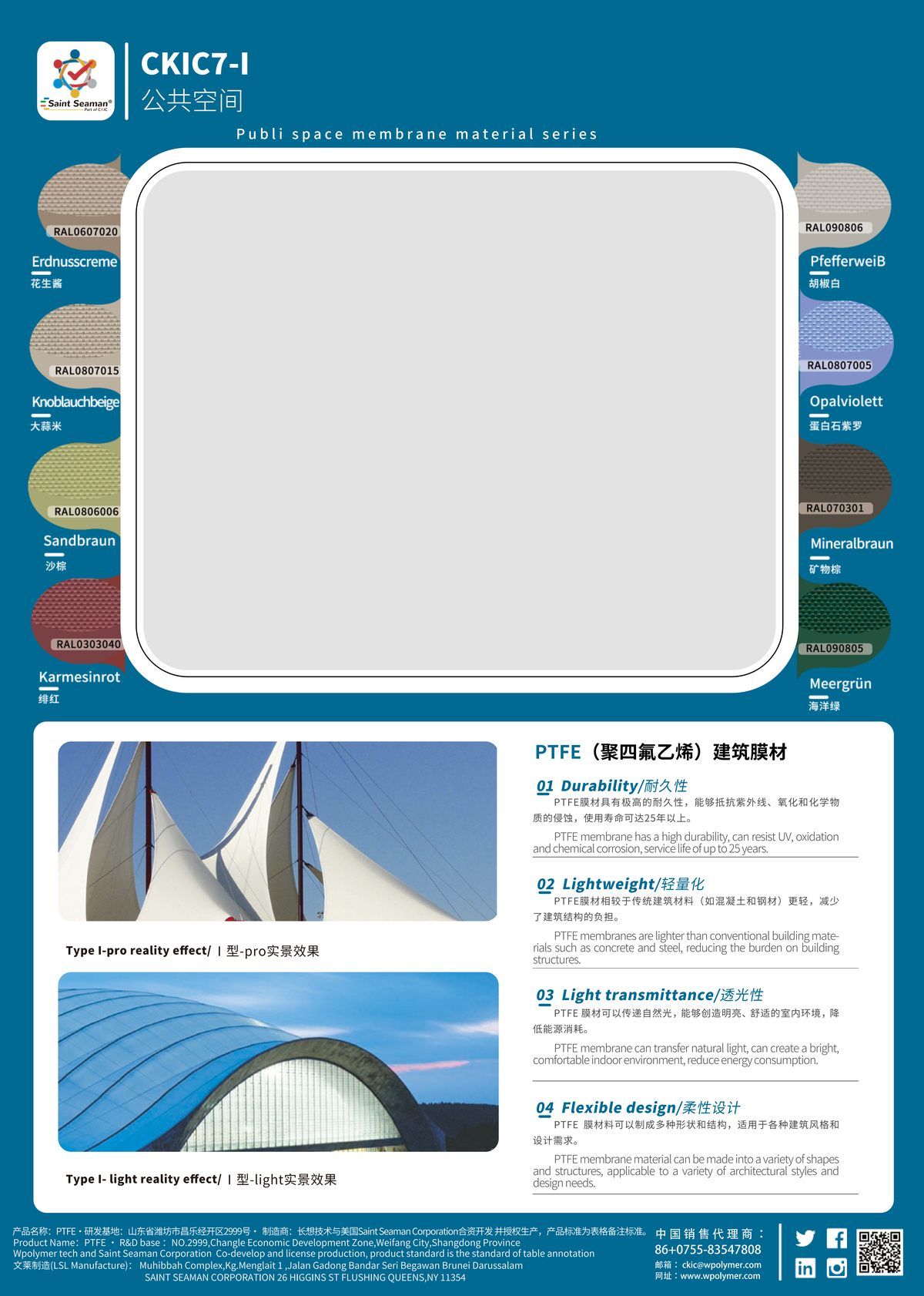 PTFE膜材具有极高的耐久性,能够抵抗紫外线、氧化和化学物质的侵蚀,使用寿命可达25年以上。PTFE膜材相较于传统建筑材料(如混凝土和钢材)更轻,减少了建筑结构的负担。PTFE 膜材可以传递自然光,能够创造明亮、舒适的室内环境,降低能源消耗。PTFE 膜材料可以制成多种形状和结构,适用于各种建筑风格和设计需求。···